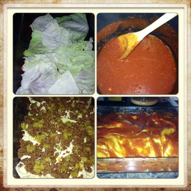 After draining the cabbage place a small amount of sauce in the bottom of large Pyrex dish. Layer Cabbage, meat, green chilies and then repeat, finishing with a layer of cabbage. Pour the sauce over the top of the cabbage.